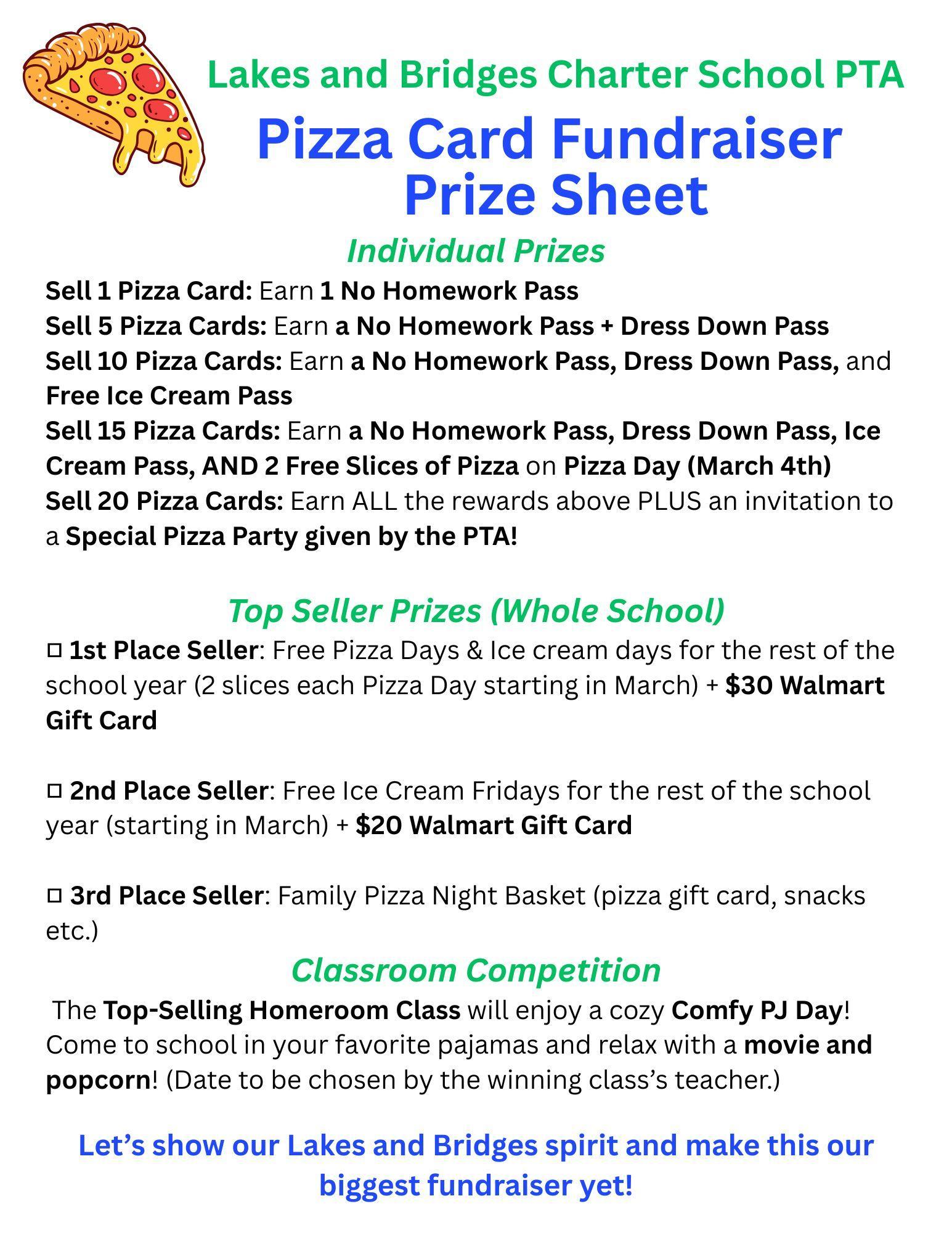PTA Pizza Card Fundraiser + BIG Prizes and Fundraiser Packet Attached Files pizza fundraiser packet.pdf pizza fundraiser prize sheet.pdf Print